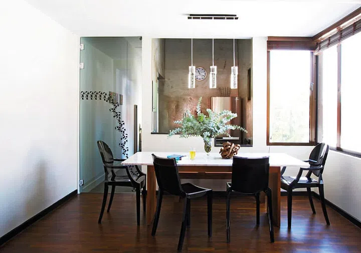 For decor help, the homeowners turned to stylist and designer Ivan Sim, known for his eclectic style. The couple initially wanted an Art Deco look, but while out shopping for furniture, ended up with more modern and contemporary pieces. The pantry's cement walls fit in with the urban yet nostalgic feel.