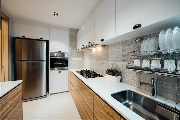 The kitchen, though enclosed, defies conventional limitations through clever interior design. A glass panel within the wall connecting kitchen and dining area ensures that light flows freely, creating an illusion of expanded space.