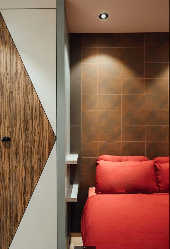 In the bedroom, a built-in cabinet becomes a canvas of material storytelling. A mix of textures and finishes speaks to the family’s nuanced design sensibilities. Where space might have been a constraint, the designers saw an opportunity – narrow ledges replace traditional side tables, a solution that is at once pragmatic and elegant.