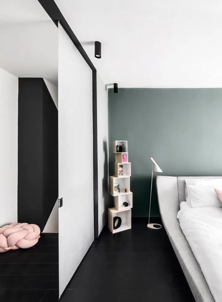 In this corner that is designed for the child to come, the walls are kept bright and chirpy but there is a block of grey adapted from the adult tones in the living area, which helps to connect the spaces visually.