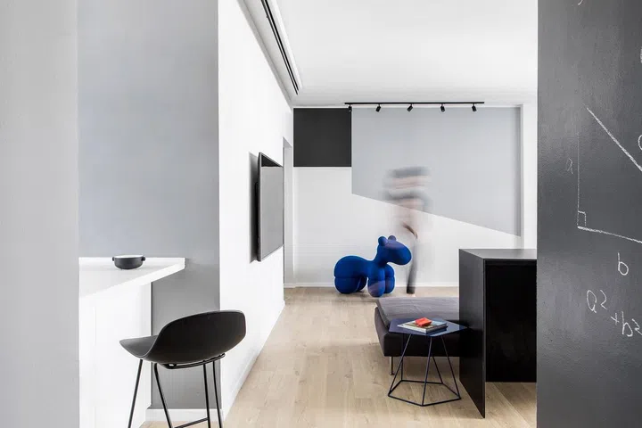 Designed by Israeli designer Yael Perry, this chic 2,583 sq ft (240 sqm) duplex apartment belonging to a young couple expecting their first child is bathed in soothing tones of greys and blues, along with some vibrant pops of colour.