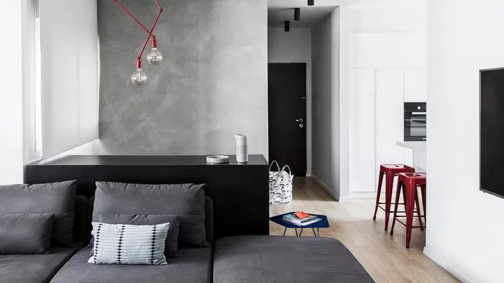 Texture. Texture. Texture. Think about adding depth to the look of your space by using textured surfaces and soft furnishing. The walls here are finished in concrete to lend the home an Industrial flair.