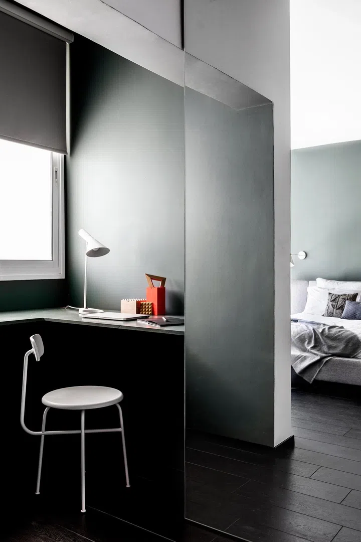 Every inch counts in the bedroom. Here, the designer used an odd corner next to the wardrobe area (cladded with a full-length mirror) and turned it into a small work zone so the homeowner can squeeze in some time to clear the emails before going to bed.