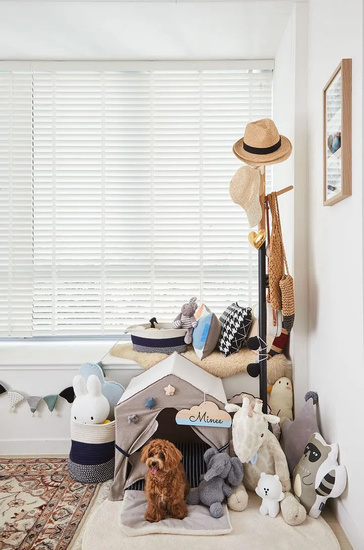 The couple’s pet dog Mimee also has a dedicated cosy corner in the master suite, complete with lots of toys!