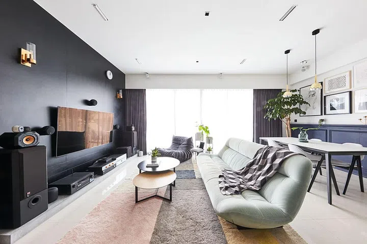 Kenneth is an audiophile, so when Darren was designing the living room, he had in mind to ensure the TV feature wall will blend in seamlessly with the various audio devices. Therefore, the walls were laminated in black and the appliances sit on a concrete base.