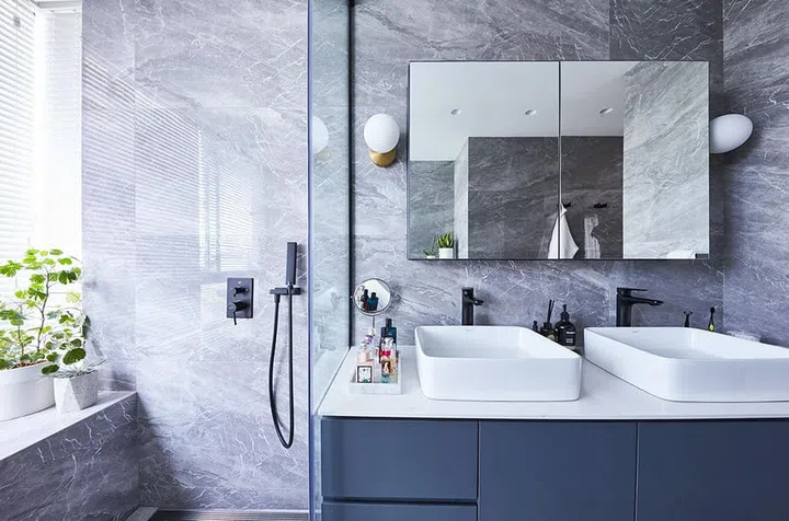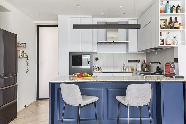 Working with Darren Neo of interior design firm Eightytwo, they decided on a modern contemporary look, complemented with classical-style features such as wainscot panels. Blue is a colour of choice that runs through various parts of the home, to tie the entire look together cohesively.