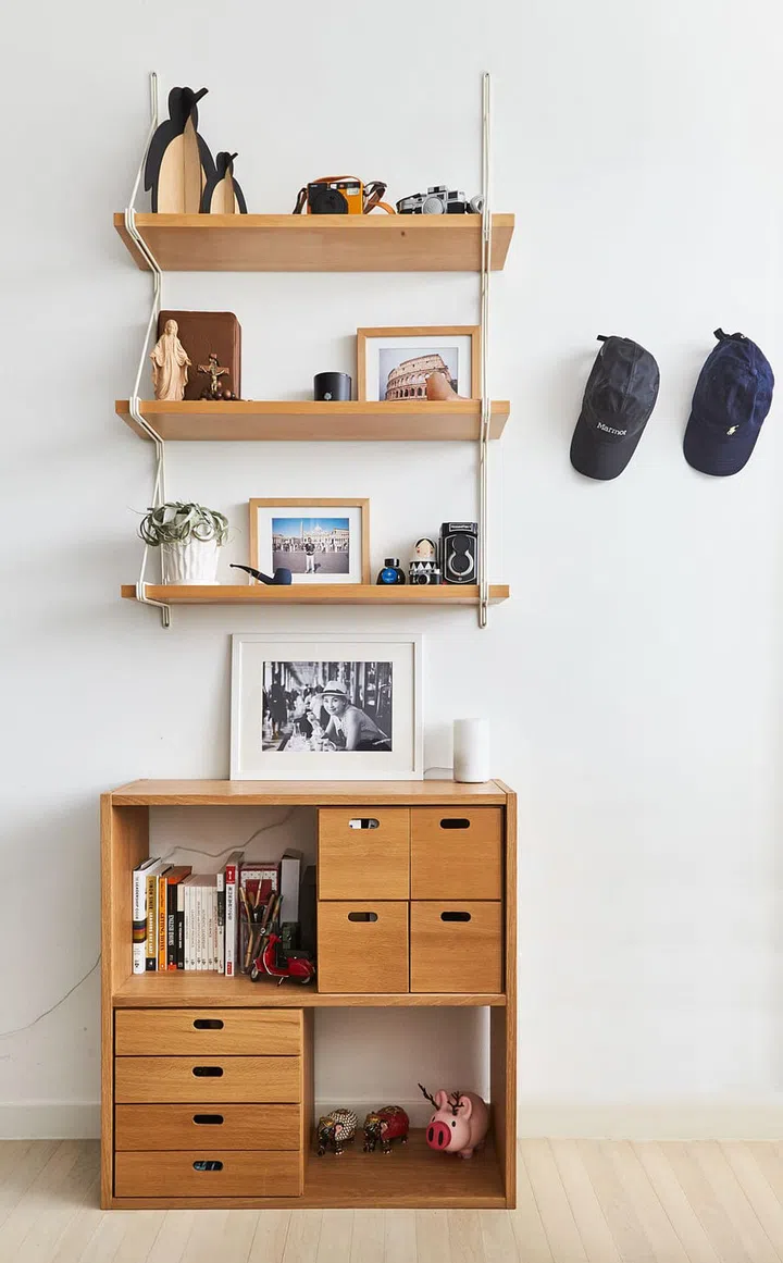 Karen repurposed these old Ikea shelves and cabinet from her previous home and created a stylish display area in the study, showcasing their favourite photos and knick-knacks