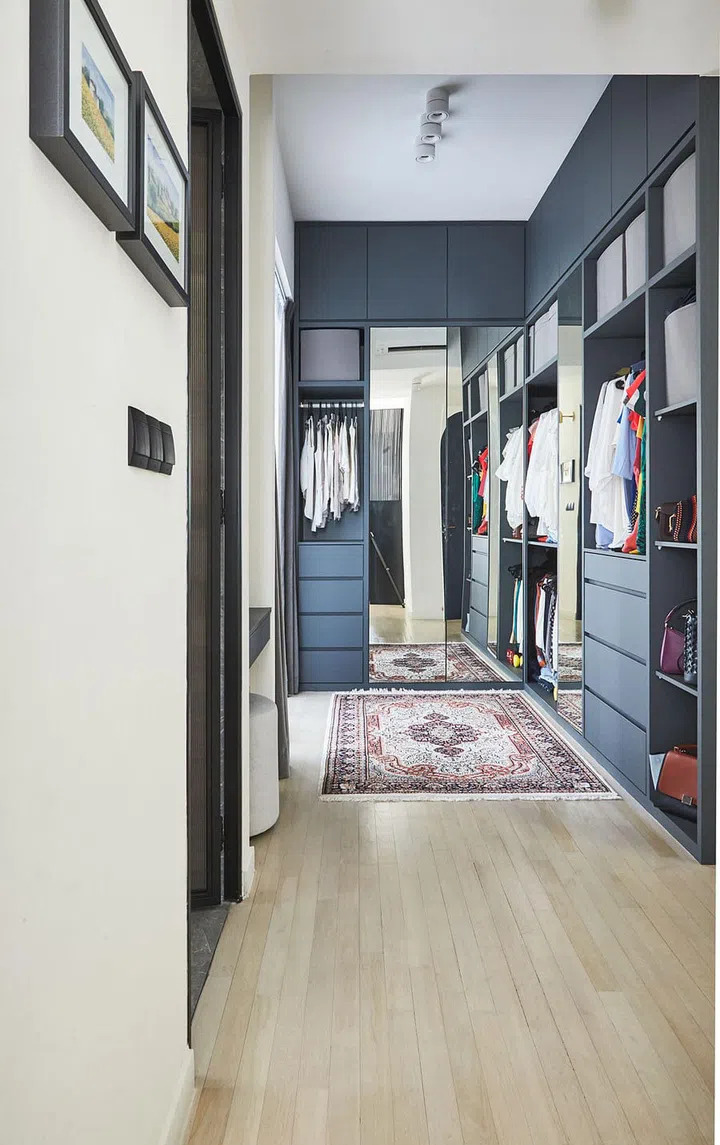 Karen enjoys dressing up in her walk-in wardrobe, which has extensive storage to house her clothing and even bag collections.