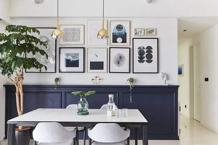 The contrast in colours, wainscoting details, a careful curation of the homeowners’ favourite prints and artworks, as well as a pair of gold-hued pendant lamps make the dining room a standout feature in the apartment.