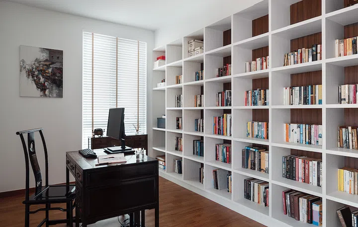 White and timber bookshelves