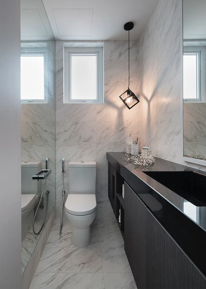 The shadow cast by a custom-designed pendant light against the white marble bathroom wall creates an interesting focal point.