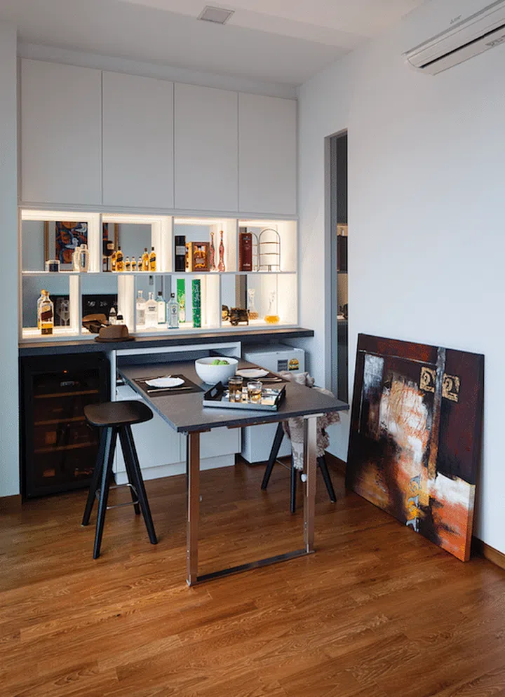 The attic bar-cum-kitchenette has a pull-out table to help maximise floor space.