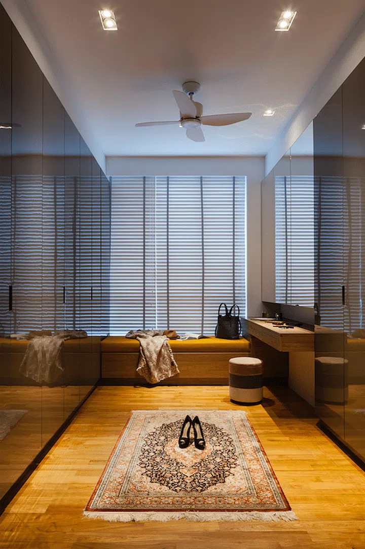 The walk-in closet is a relaxing space that resembles a hall of mirrors. A bench seat doubles as storage space.