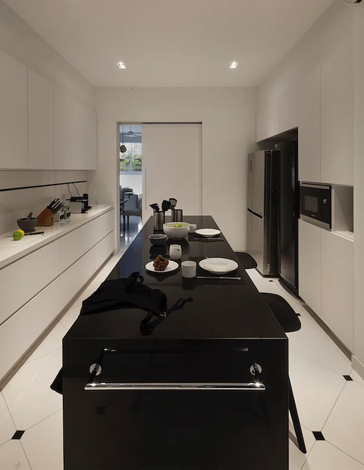 Despite the kitchen’s long, narrow layout, the team managed to incorporate a kitchen island that provides extra storage, in addition to the built-in cabinets.