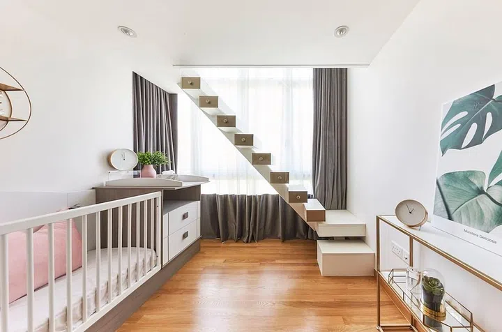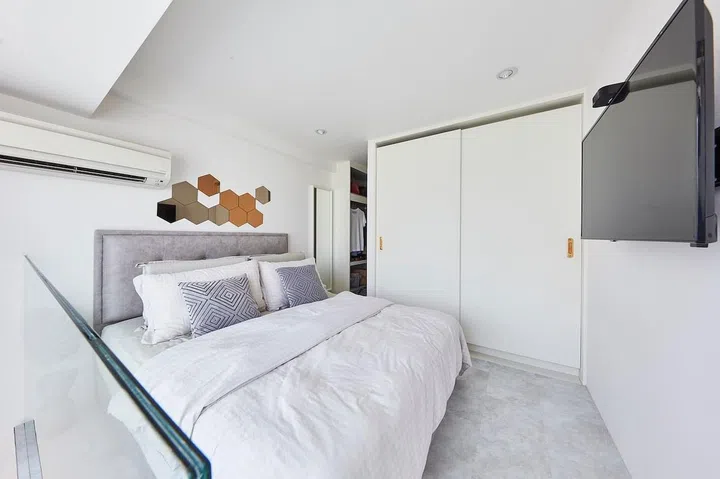 The 4.27 metre high ceiling of this ground floor unit presented the perfect opportunity for Carmen to increase storage space by adding two lofts — one above the dining area and another in the master bedroom, along with various additional storage and wardrobe provisions.