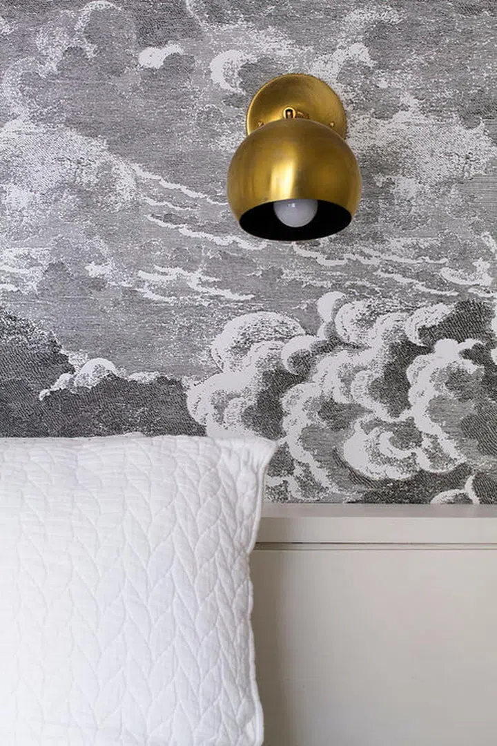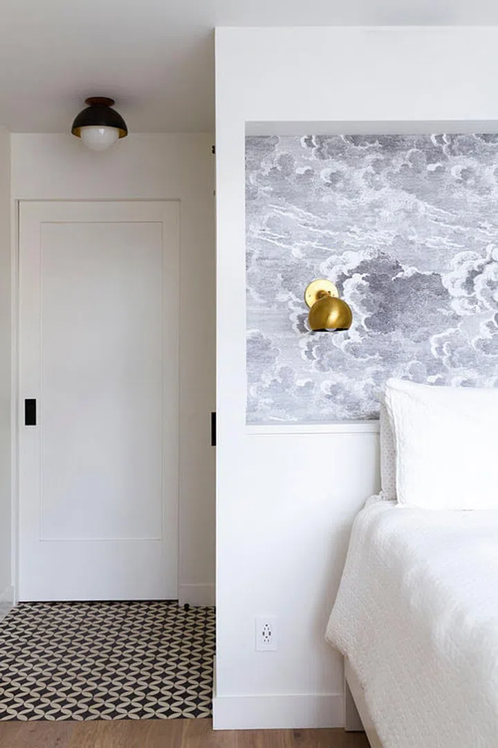Black and white floor tiles, and a printed wallpaper, add visual interest to the master bedroom.
