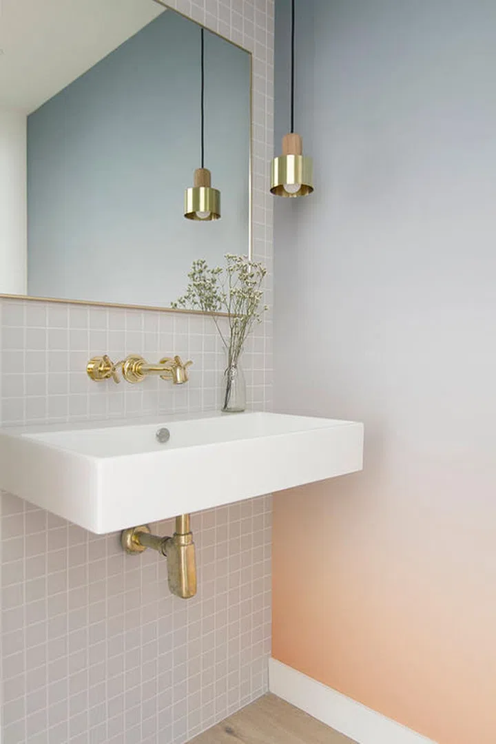 Not everything is clad in white - we love the Ombre effect on the walls, whose orange tint went well with the bathroom's brass-finished fittings.