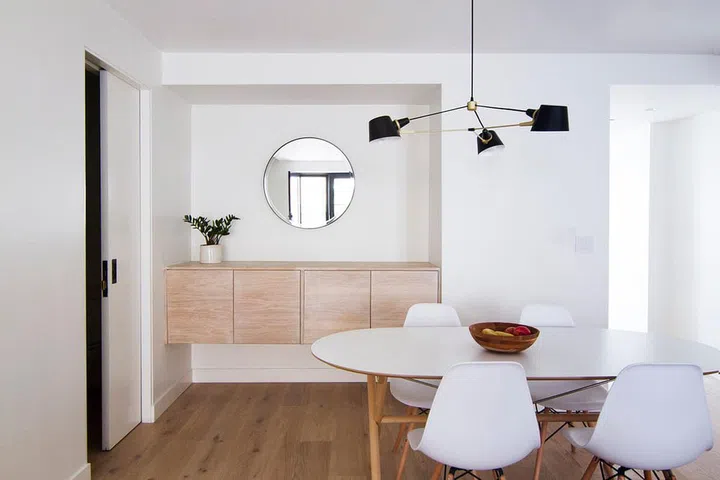 The General Assembly team combined the living room with the rear patio, and enlarged the kitchen on the bottom floor. Light, natural oak adds warmth to the all-white palette.