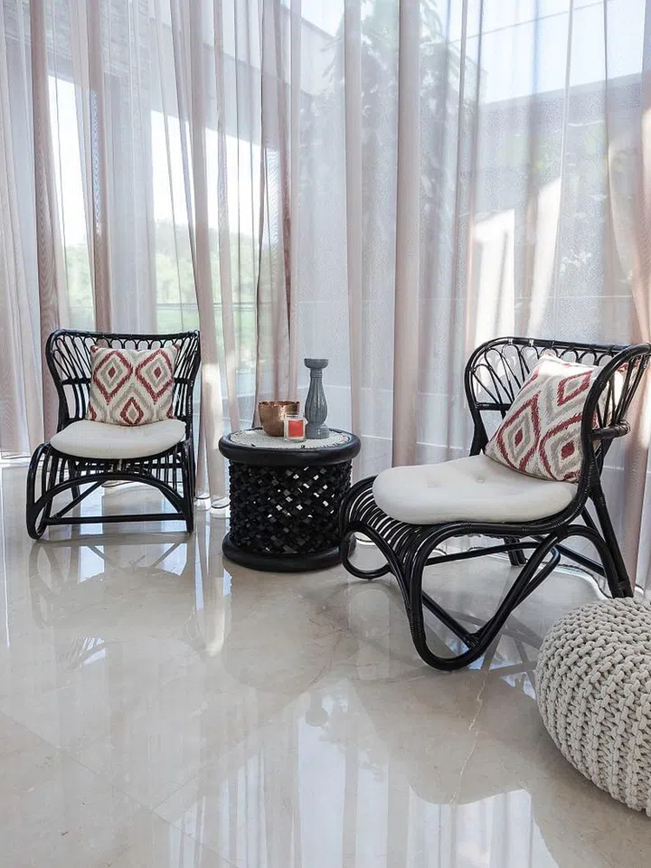 Retro rattan chairs have been painted black for a contemporary look.