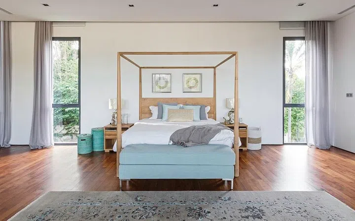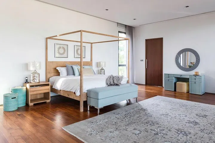 In the spacious master bedroom, the homeowners' wooden four-poster bed is filled with, and surrounded by, shades of blue.