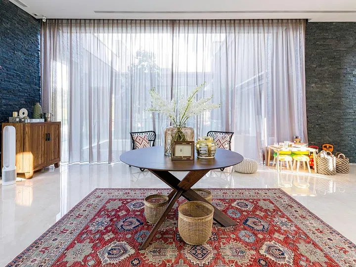 The long and spacious living room allowed space for a foyer, which has been anchored by a large red Moroccan-style area rug.