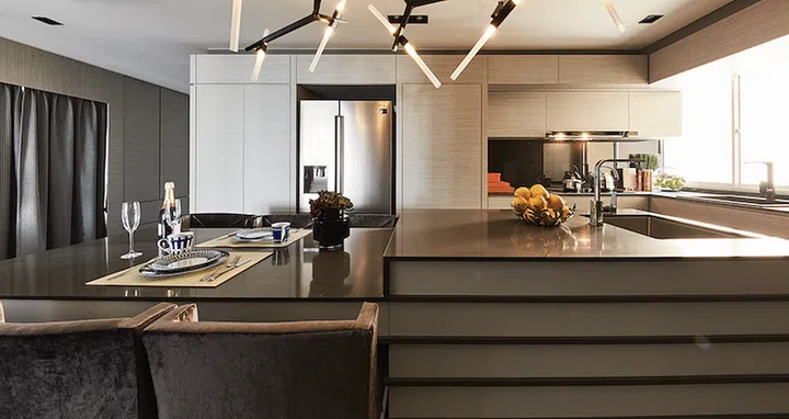 The existing walls of the kitchen were also hacked to create an open-concept dry kitchen and dining area defined by a kitchen island and dining table centrepiece.