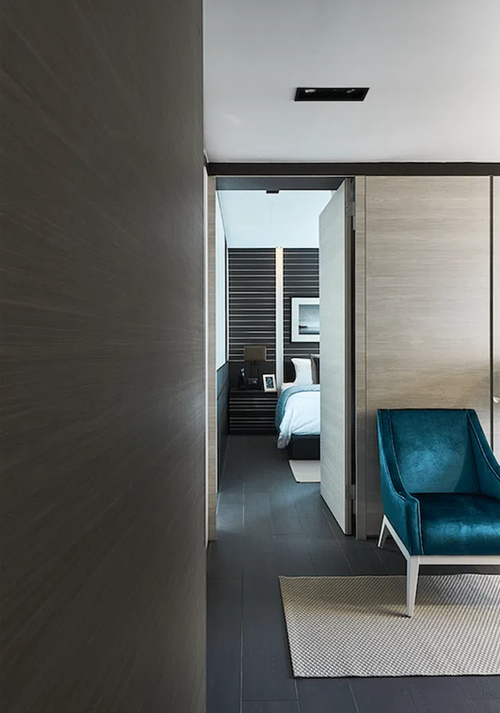 All the doors and built-in cabinets are flush with adjacent walls to create a seamless effect throughout the apartment.