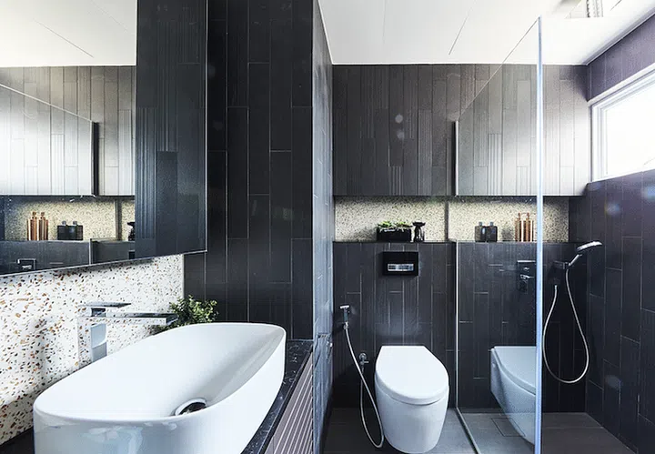 Interior designer Adrian extended the master bath outwards to create more space to accommodate a His and Hers basin. The existing bath tub was removed and converted into a shower compartment instead.