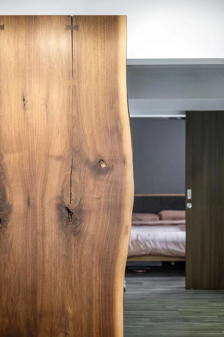 While the communal spaces of the home are kept open, the bedrooms enjoy a heightened sense of privacy. A handsome American walnut slab, supplied by local wood supplier Grey and Sanders, was used to make a door separating the two zones.