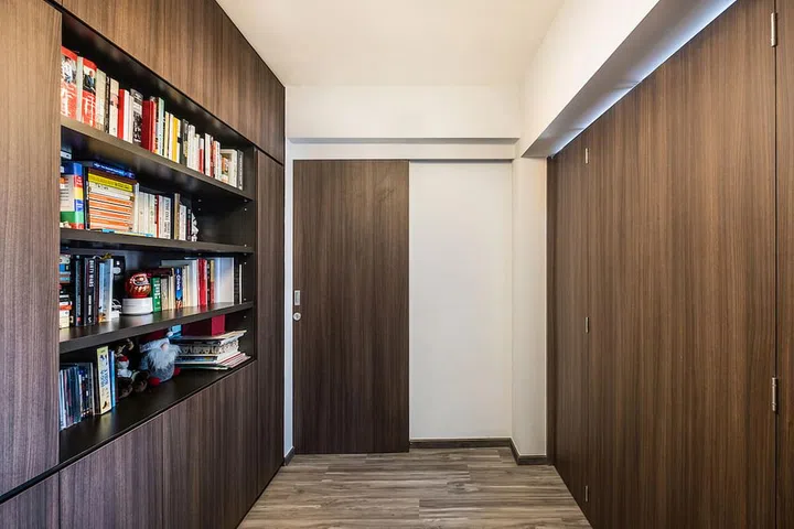 The designers purposed a lounge area along the corridor with a built-in bookshelf and storage unit.