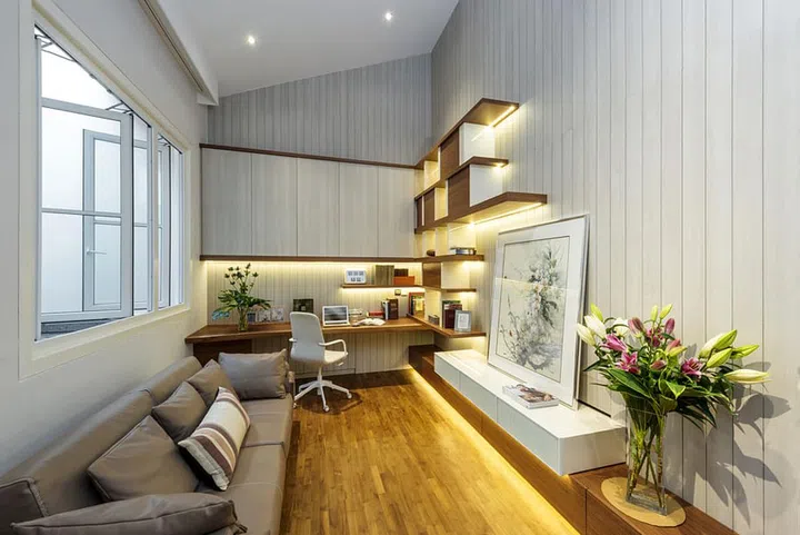 Meanwhile, the couple's two children have their bedrooms on the upper floors. The children had a hand in the design. For example, the son's room is done in a tatami-style, as the boy prefers a Zen-like ambience.