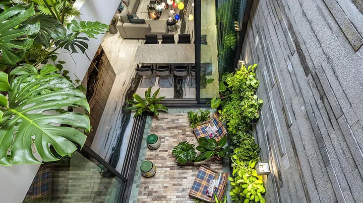 To further enhance the courtyard, vertical greenery was added, together with some colourful seats. "We like chilling out after dinner in the courtyard," says the owner. "And when we do have friends over, there are plenty of spaces where everyone can sit and chat on the first floor."