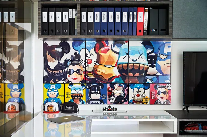 The wall above the desk has colourful artwork depicting Kaws’ iconic characters.