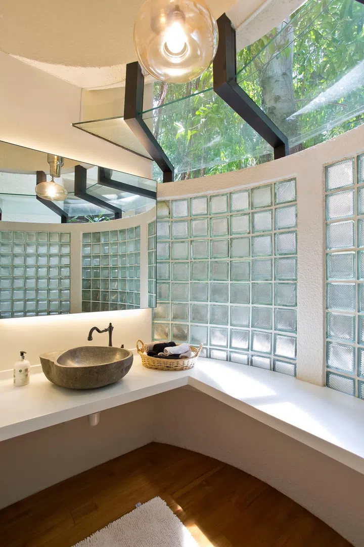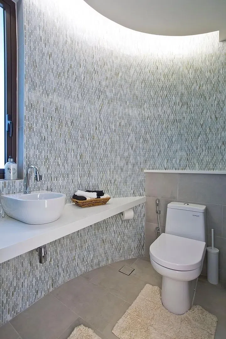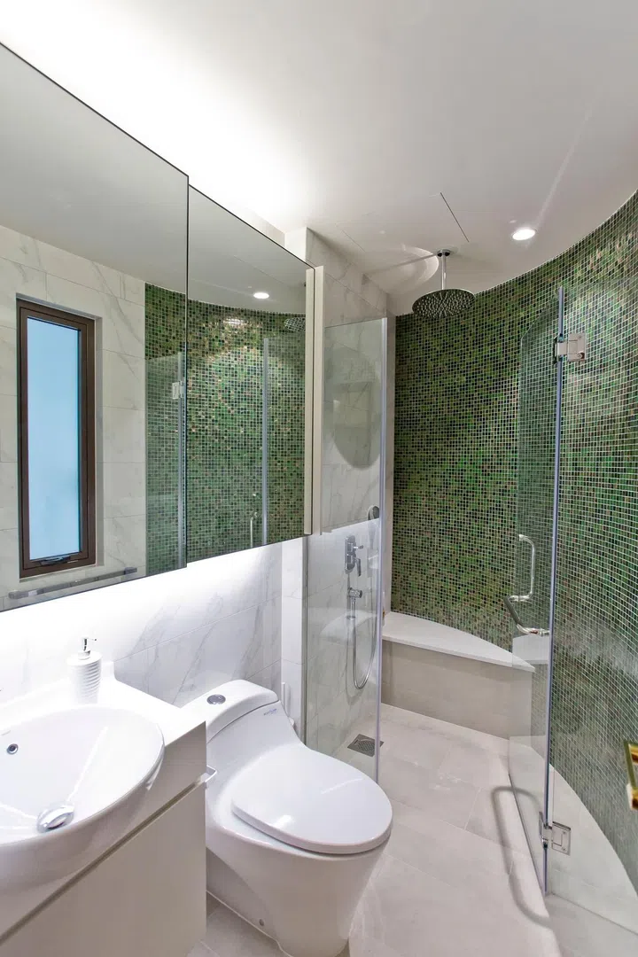The bathrooms of this 3,400sqf home has curved silhouettes, which presents a challenge to the designer. Mosaic tiles, due to its small size, can clad the curved wall beautifully.