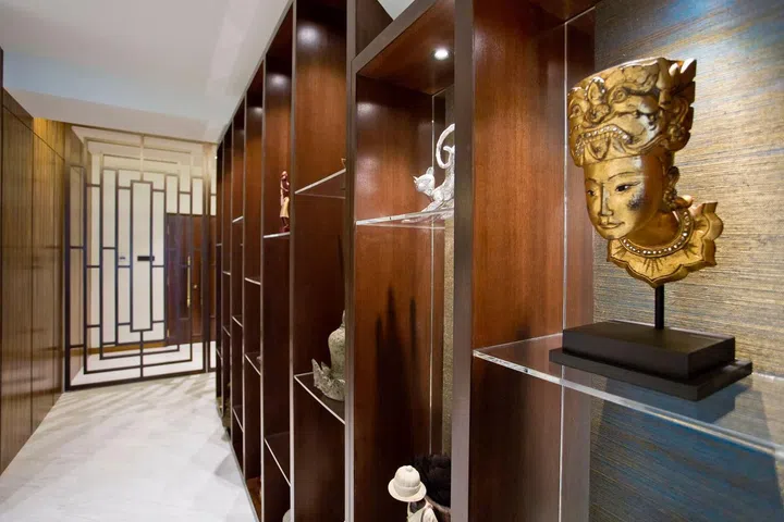 The homeowner favours geometric designs, and have used this design element consistently throughout the home. The rectangle motifs also make it easy for knick knacks and sculptures to be displayed neatly.
