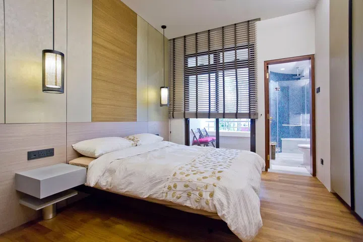 The bedroom is kept simple and restful, with light wood features instead of dark. One interesting feature about this home are its bathrooms. See the next picture to find out why.