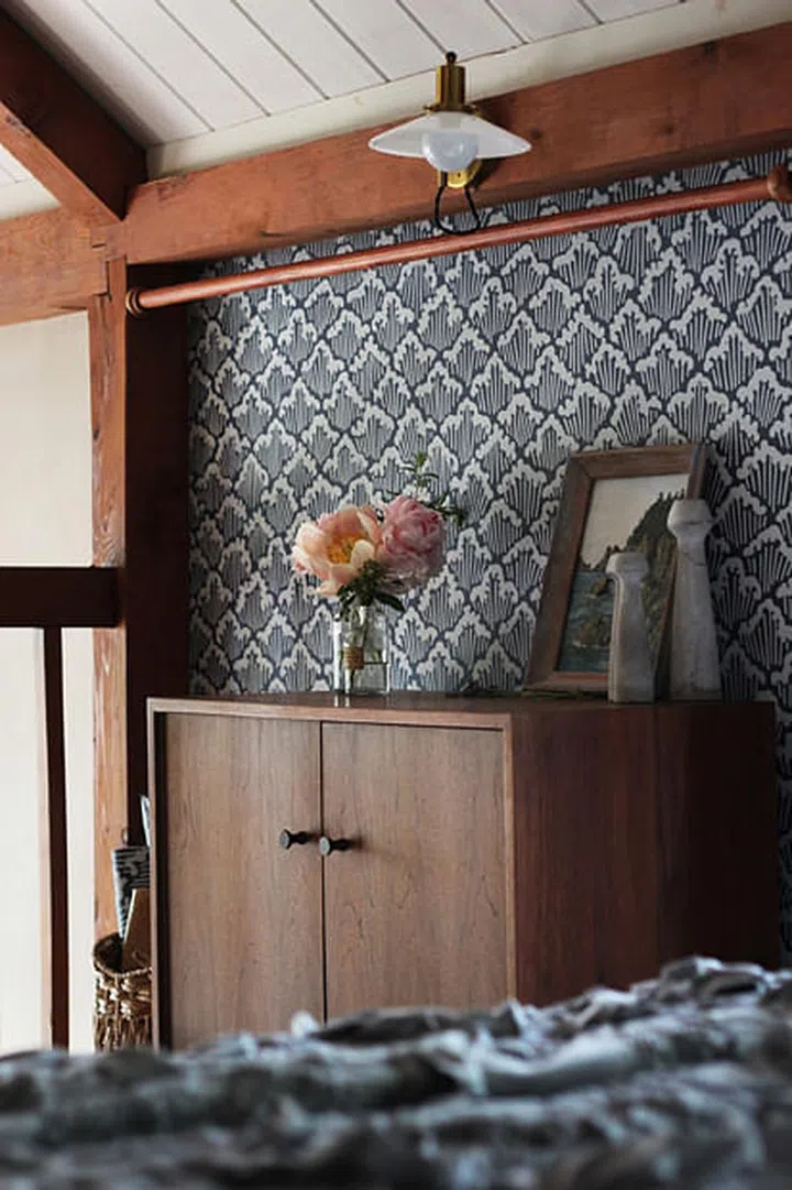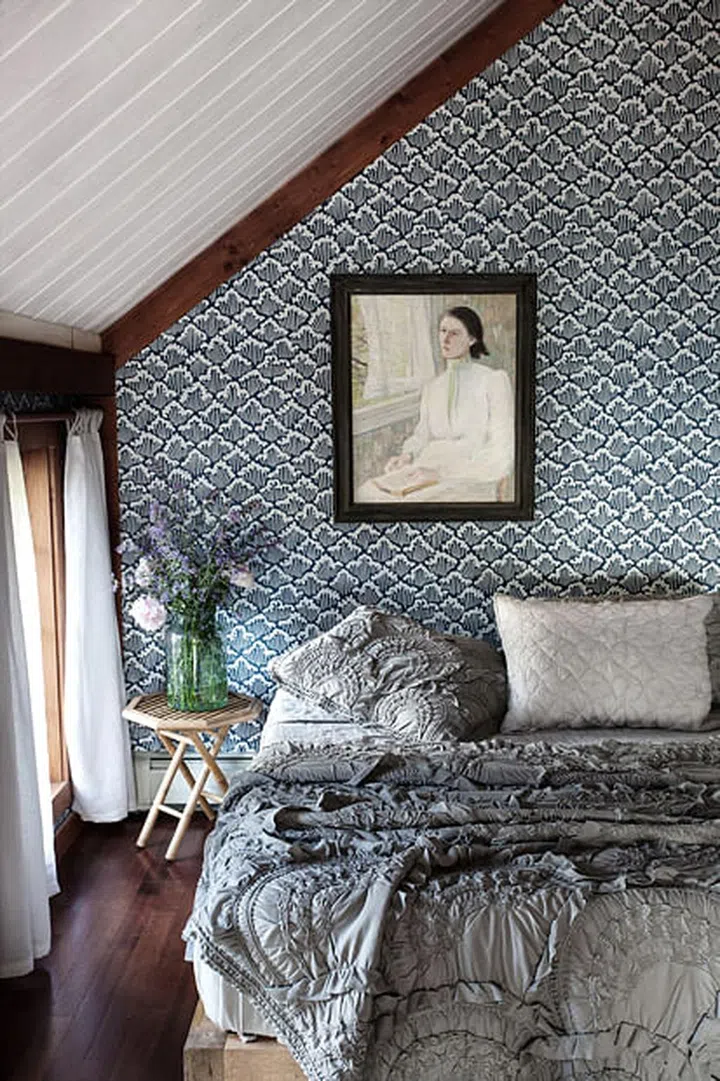 To match the view of the sea, this wave-inspired wallpaper by Farrow & Ball was chosen for this bedroom.