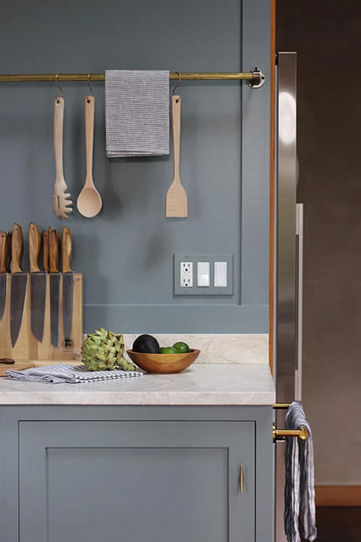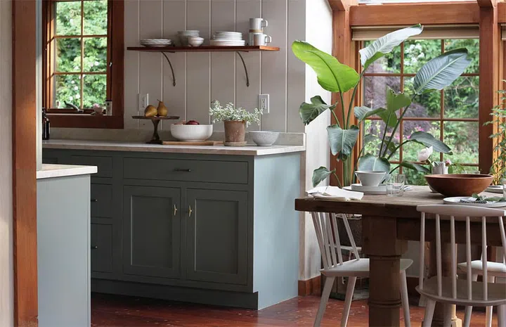 A cool grey-blue hue was chosen for the kitchen; its soft tone juxtaposes brilliantly with the vibrant greenery outside.