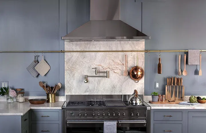 Brass and copper accents, in fittings as well as crockery, enhances the kitchen with a touch of luxe while the stone counter and backsplash brighten up the home.