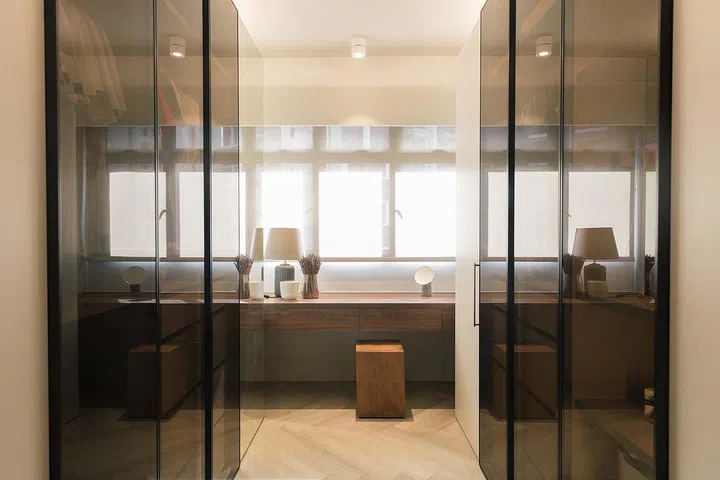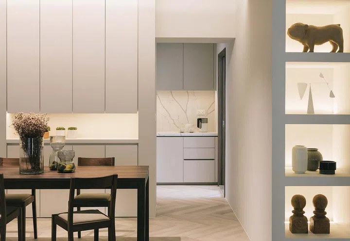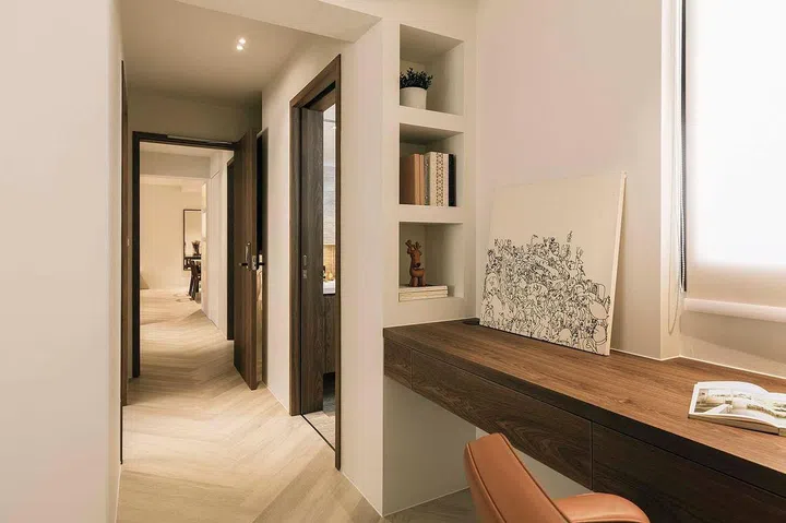 The relocated corridor allows for the addition of built-in display niches to conceal the household shelter door, with enough space for some additional storage on the other side of the door.