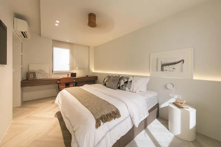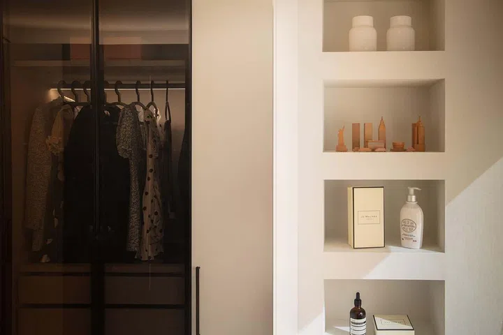 The shift also created an alcove in the master bedroom for a cosy study corner, as well as a small recess beside the bedroom door.