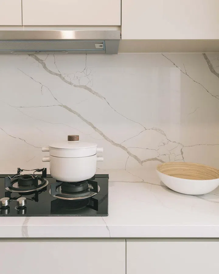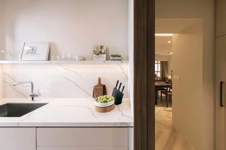 The kitchen’s quartz surface features gold veins that resemble Japanese pottery’s kintsugi technique.