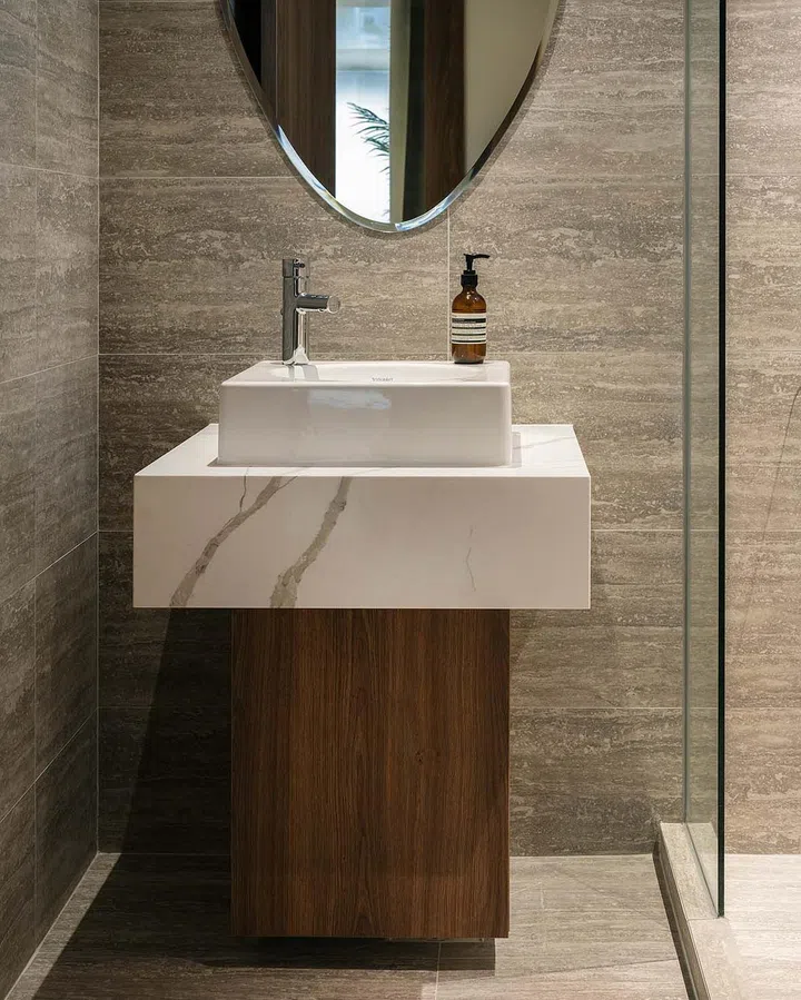 The organic-shaped mirror in the common bathroom is a delightful surprise amidst the predominantly rectilinear forms in the apartment.