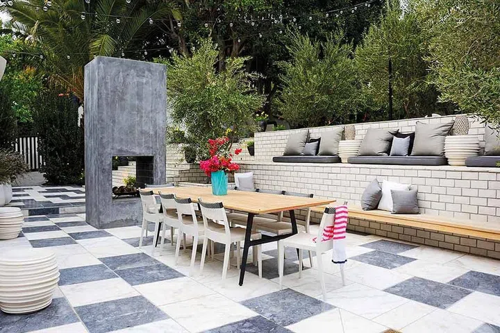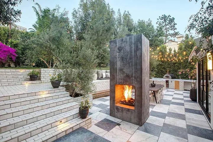Populated with lemon and olive trees, the stunning terraced backyard provides shade and privacy for the outdoor kitchen and dining area near the oval-shaped pool.