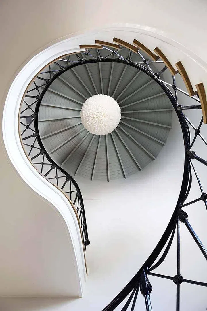The stunning stairwell was restored to its original state with an addition of a contemporary pendant light.