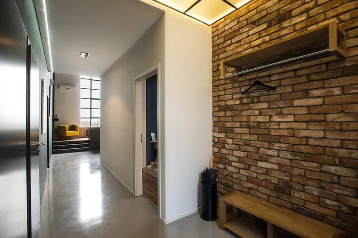 For visual interest, a raw brick wall is the first thing one sees when entering the space, followed by black and white walls along the corridor into the living area.