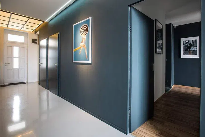 A smoky blue shade is used for the walls and room doors — a clever way to create a seamless look.