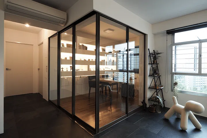 This clever design solution exemplifies the modern approach to open-plan BTO living - the study can transform from an integrated part of the living space to a private work sanctuary with just a gentle slide of the glass panels. It’s a perfect example of how thoughtful interior design can create spaces that adapt to changing needs throughout the day.