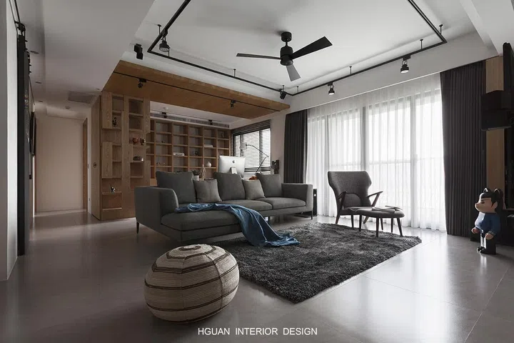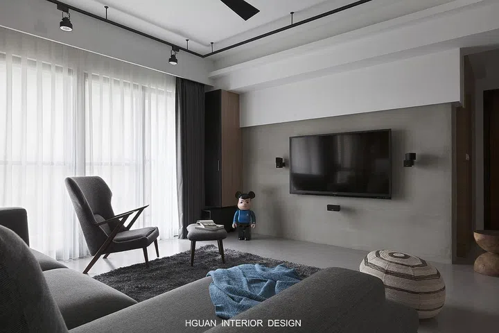 Designed by Taiwanese interior design firm Hguan Interior Design, the living room is spacious and designed understatedly. The designer and homeowners furnished it with furniture in a singular colour tone to match the concrete screed wall behind the TV.