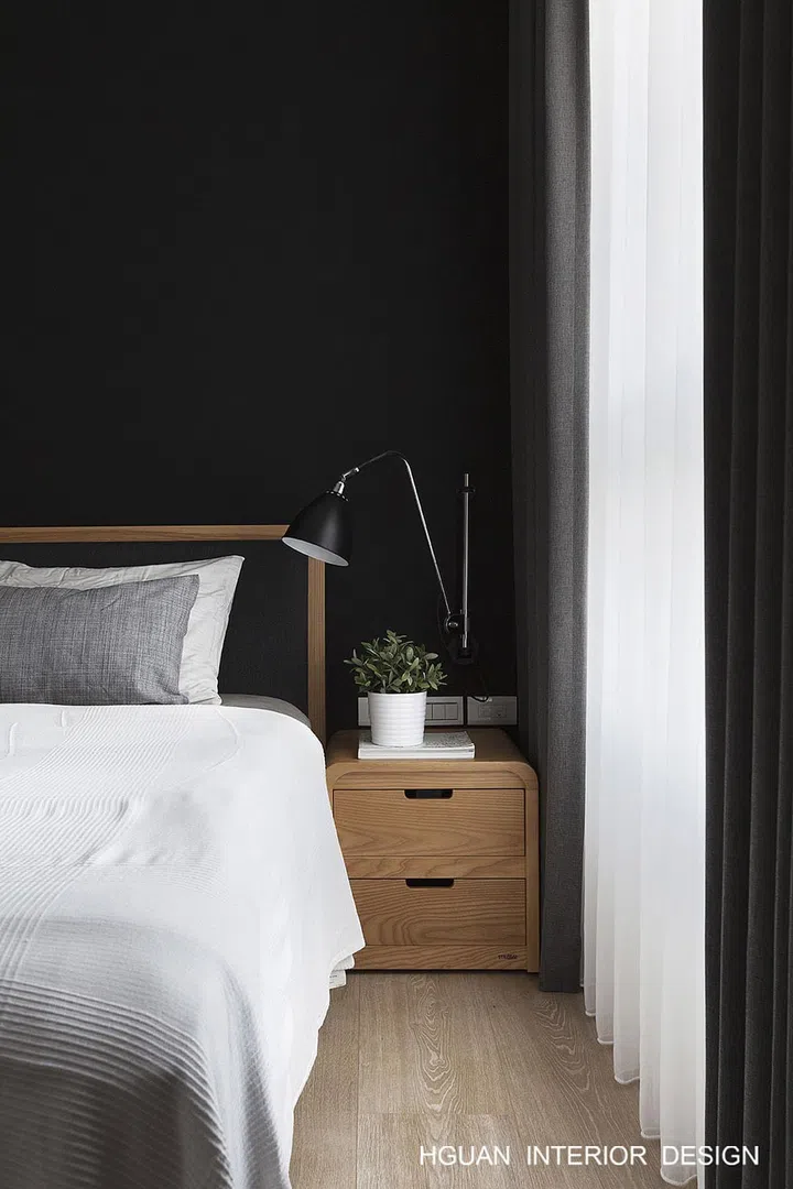 For a restful ambience in the master bedroom as well as an overall holistic look, the homeowners chose a dark grey palette, complemented with wood finishes on the headboard and cupboard.